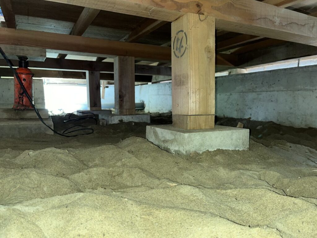 【震災復旧工事】新潟市中央区 K様邸レベル調整工事 レベル調整(傾き修正) 能登半島地震の影響で傾いた住宅の修復をしました。傾きは最大で8cmでした。今回は「沈下修正工事」と「レベル調整工事」を併用しての修復でした。ご予算や建物の状態に応じてやり方も調整できます。